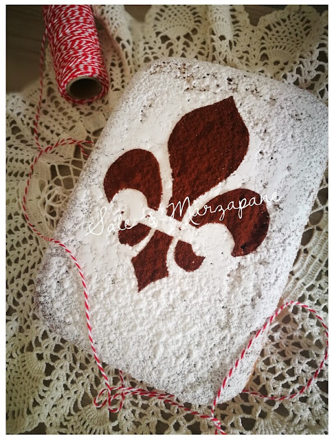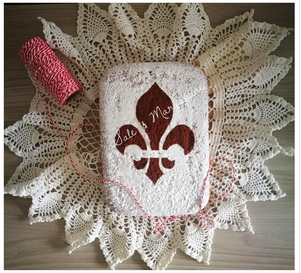 - Per rispettare la tradizione stampate su un foglio di carta il tipico giglio di Firenze e ritagliate la parte interna del giglio. Quindi appoggiate la mascherina ottenuta sulla schiacciata e spolverizzate con cacao. Togliete con molta delicatezza la mascherina ed ecco il giglio.