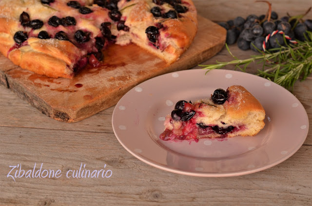 Ungere una teglia (io, rotonda diam 28cm), stendere una metà impasto con le mani. Mettere gli acini su tutta la superficie, lasciando liberi i bordi, condire con olio un cucchiaio e 50g di zucchero. Coprire con l’altra metà della pasta, richiudere i bordi con le mani e poi mettere sopra i restanti acini e il resto dello zucchero, cospargere con foglie di rosmarino e condire con un filo di olio. Attendere 30-40 minuti, per la seconda lievitazione.