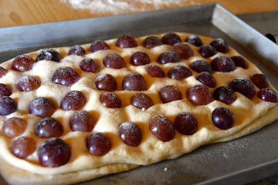 Ho rifatto la medesima procedura di prima mettendo altri chicchi d’uva anche sul secondo strato di pasta e un’altra generosa manciata di zucchero. Ho terminato con un filo d’olio e ho lasciato che l’impasto lievitasse ancora a temperatura ambiente, coprendolo con un canovaccio.
