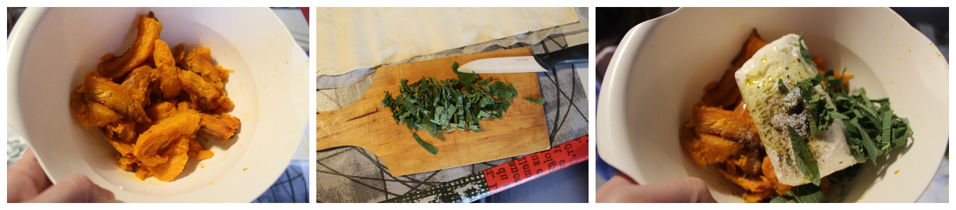 Lavate le foglie di salvia, asciugatele con carta da cucina e tagliatele a striscioline, utilizzando un coltello di ceramica o di plastica, così le foglie non perderanno la loro fragranza; se non possedete questi coltelli spezzettate le foglie con le dita. Unite quindi, la salvia alla polpa di zucca, aggiungete i formaggi e i condimenti, mescolate bene per amalgamare il tutto.