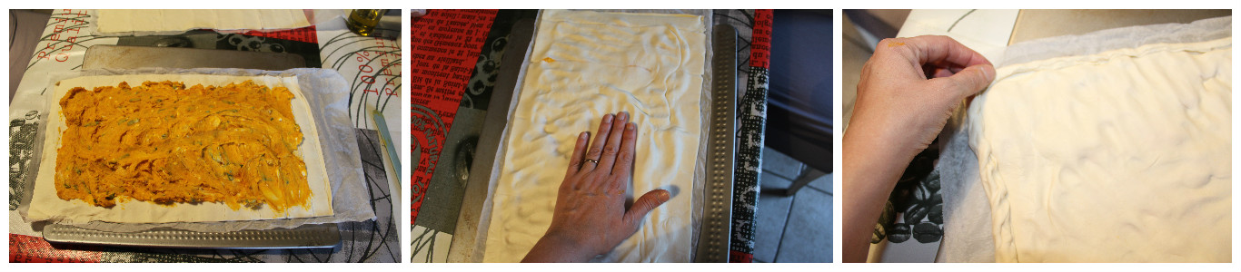Srotolate i due rotoli di pasta sfoglia, sistematene uno con la sua carta forno su una placca, spalmateci sopra il composto di zucca in uno strato uniforme, lasciando circa 2 cm dai bordi. Ricoprite con l’altro rotolo di pasta sfoglia e schiacciate con il palmo delle mani per fare aderire il tutto e far uscire l’aria.