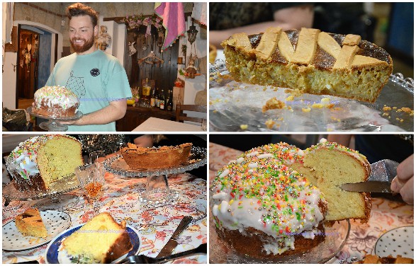 E in chiusura i dolci della casa fatti dalle mani esperte di Tobia, in una scampagnata di Pasquetta non possono mancare la classica pastiera e il casatiello dolce locale (da sottolineare il profumo che intanto si diffondeva nelle due sale, di altri dolci in preparazione e cottura nella vicina cucina).