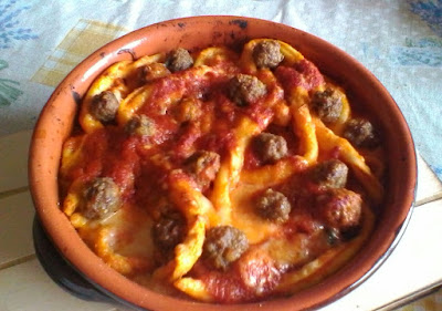 Lessate le scilatelle in abbondante acqua salata nella quale verserete un filo d’olio, scolatele e versatele in una tegame capiente ( io una tiana ) che possa andare anche in forno. Conditele con una parte del sugo e aggiungete via via il parmigiano, una parte delle polpettine e le uova sode, la scamorza e la soppressata precedentemte tagliuzzate. Amalgamate il tutto.