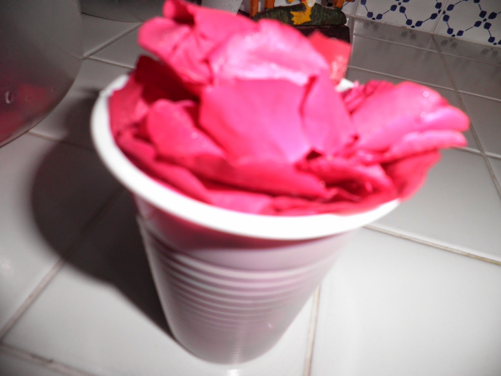 Utilizzo come unità di misura un bicchiere di plastica: tanti bicchieri riempirò di petali, altrettanti ne riempirò di acqua e di zucchero.