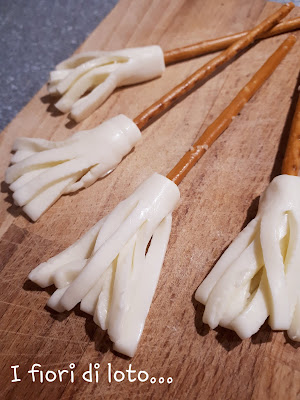 Con un coltellino incidete tante striscioline sottili. Arrotolatele sul bastoncino salato come sivede nell’immagine.