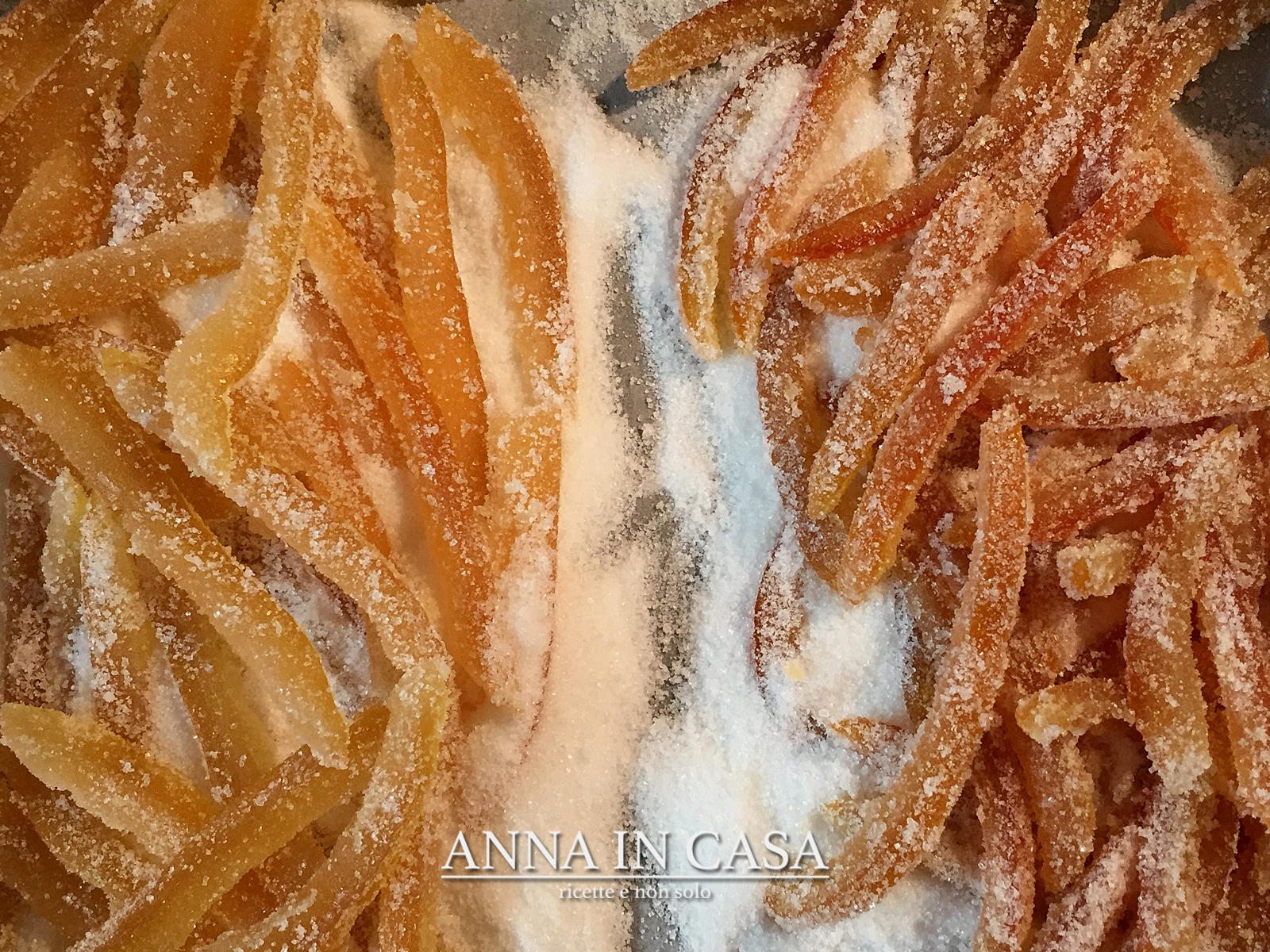 Togliere le scorzette dalla pentola e disporle su carta da forno. Staccarle l’una dall’altra e lasciarle raffreddare.