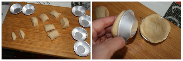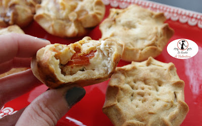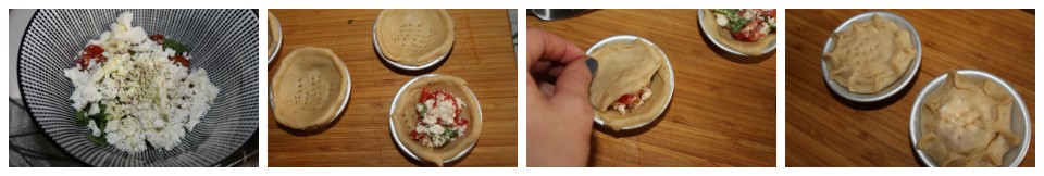 Dopo aver forato con una forchetta il fondo di ogni tartelletta, riempite i 6 stampini col composto di pomodorini e formaggio; prendete i dischetti che avete tenuto da parte e chiudete ogni scrigno pizzicando i bordi con le dita, a formare una specie di fiore.