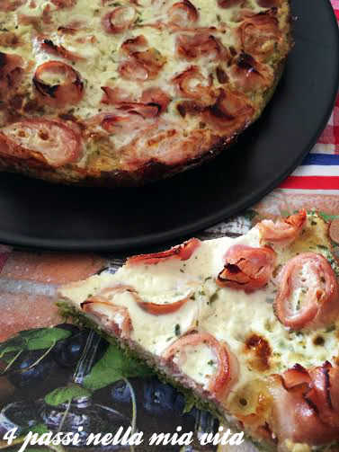 Versiamo il composto in una teglia rotonda leggermente oliata, sistemiamo sulla superficie il prosciutto cotto arrotolato a roselline e cuociamo in forno ventilato a 180°C per 20-25 minuti