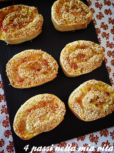 Trascorso il tempo necessario, riprendiamo il rotolo, tagliamolo a fette spesse 2-3 cm e cospargiamole di semi di sesamo.