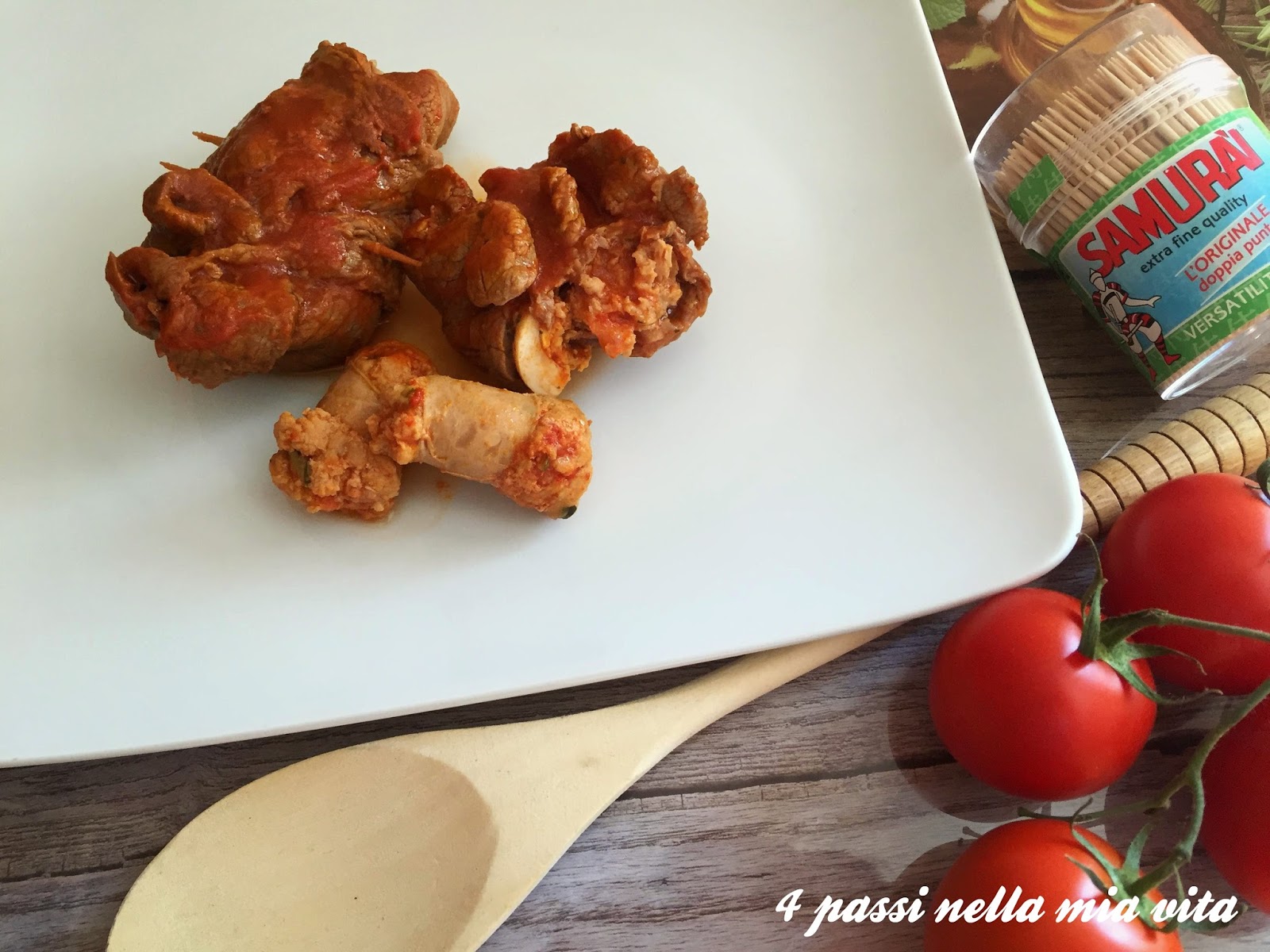 Arrotoliamo le fettine e fermiamo l’involtino con un paio di stuzzicadenti.