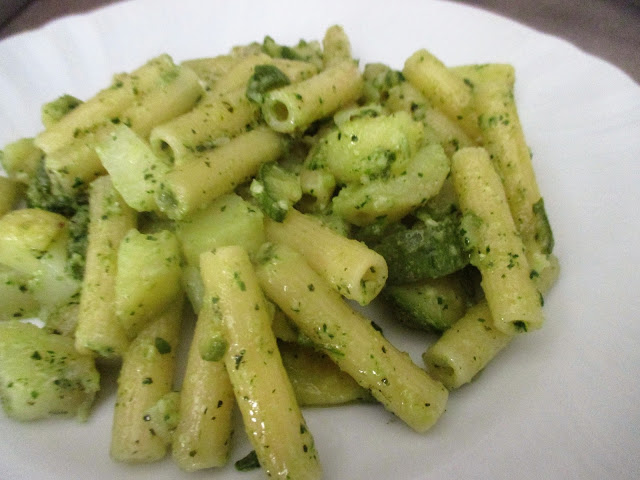In una pentola di acqua bollente, cuocete la pasta. A cottura ottenuta, scolatela e mettetela in una ciotola con il pesto e le patate. Mescolate bene quindi servite
