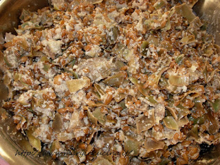 Eliminare le parti più dure e le spine dei carciofi e tagliarli finemente, coprirli di acqua e del succo di 1 limone e lasciar riposare per una mezz’oretta. Trasferire tutto in una pentola e quando inizia l’ebollizione spegnere la fiamma ed eliminare l’acqua di cottura. Unire carciofi e segale. Tritare le noci con sale pepe ed erbette ed aggiungere tanta acqua quanta ne serve per ottenere una crema. Aggiungere la crema di noci ed un filo di olio alla segale, amalgamare bene. E’ buona anche fredda da portare ad un pic nic.