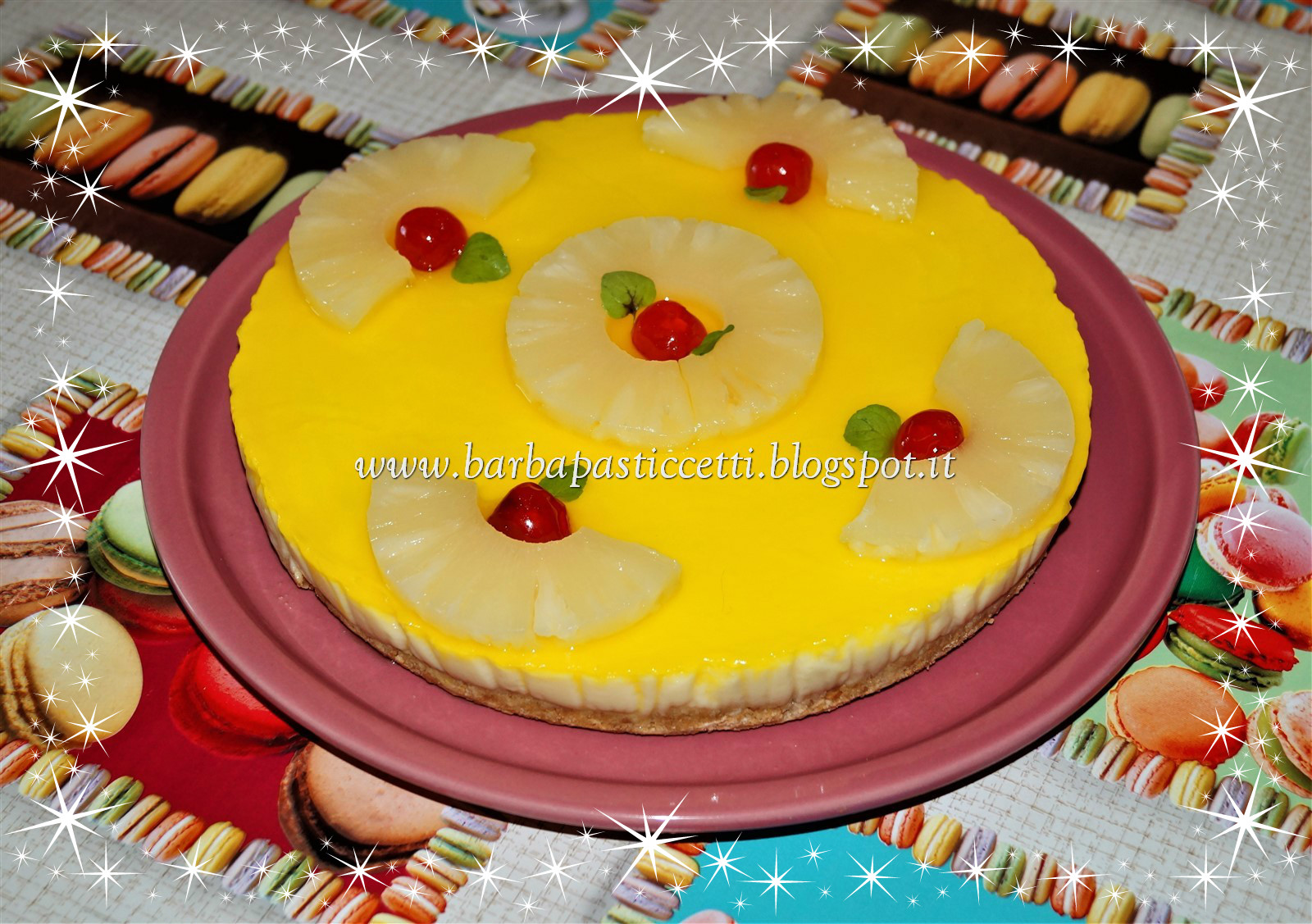 Mettere la torta in frigogrifero e e decorarla poco prima di servirla, utilizzare fettine di ananas, ciliegie candite e foglie di menta fresca.