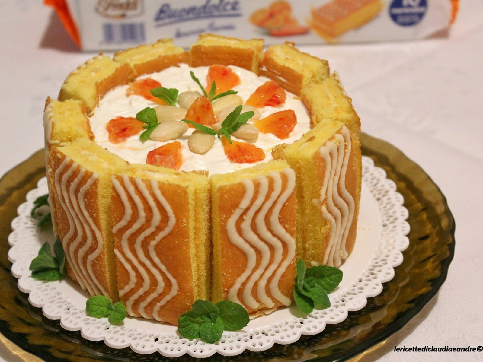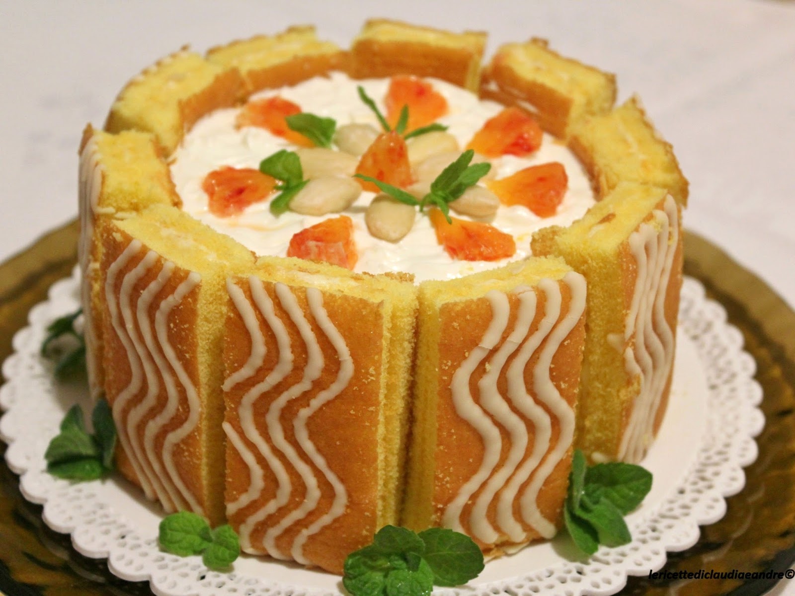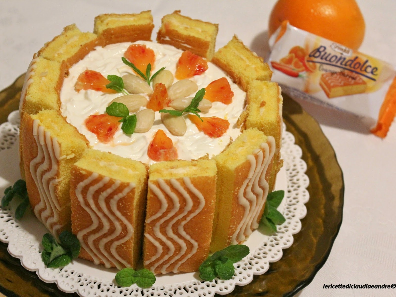 - Decorare con i pezzi di arancia rimasti, con le mandorle intere e con le foglioline di menta.