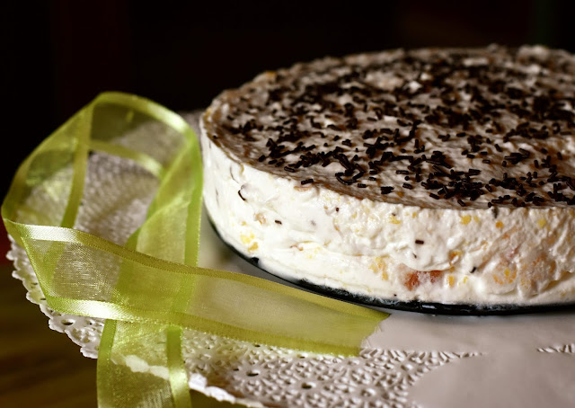 Uniamo tutti gli ingredienti (panna e frullato), aggiungiamo il cioccolato in gocce o codette e versiamo il composto in uno stampo. Io ho scelto uno stampo classico per torte da 24 cm di diametro.