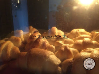 Questa mattina ho levato la boule con l’acqua calda e la teglia con i cornetti e ho preriscaldato il forno a 175°, ho rimesso la teglia e ho cotto per circa 10 minuti, girando la teglia dopo 5 minuti per dare una cottura uniforme.