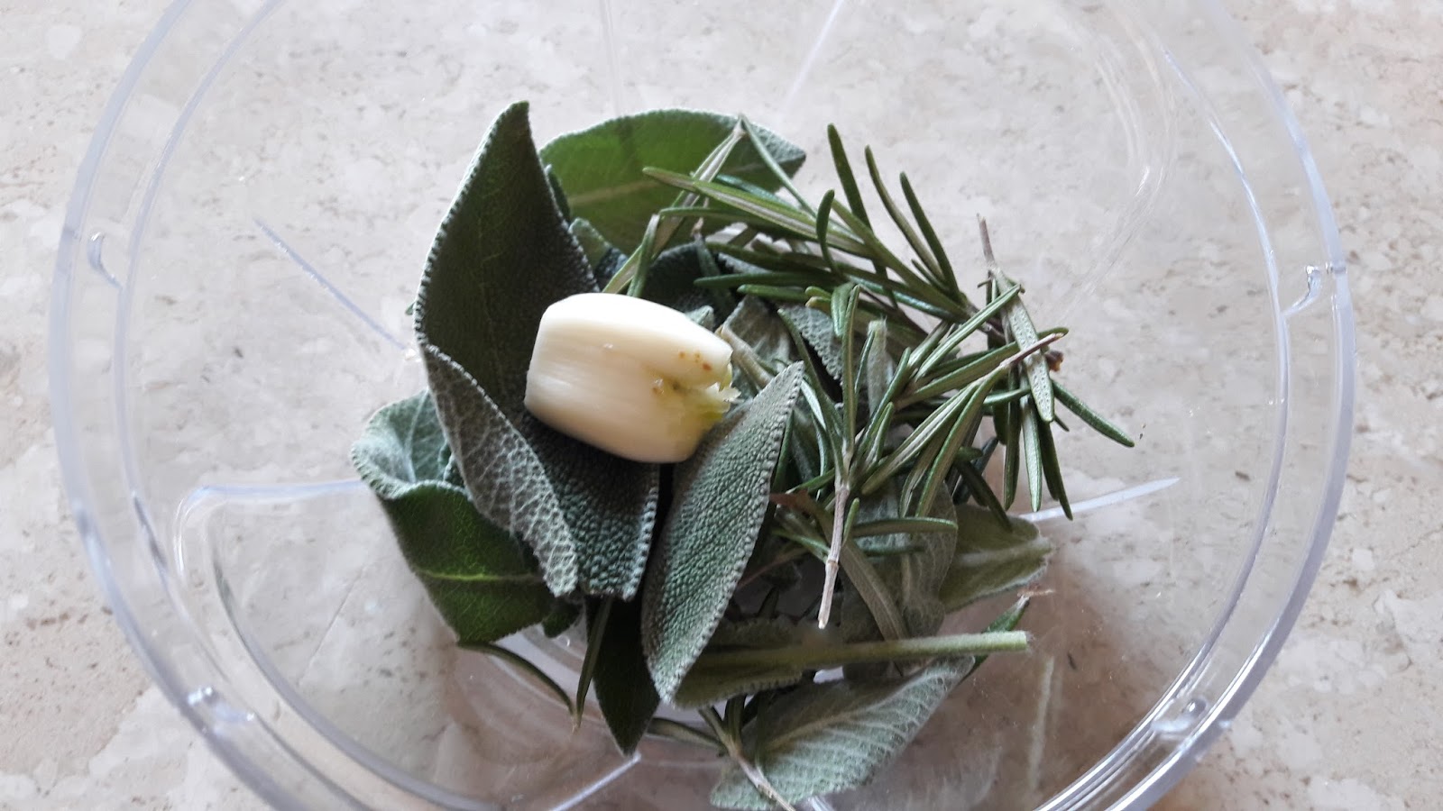 Tritate la salvia, il rosmarino e lo spicchio d’aglio.
