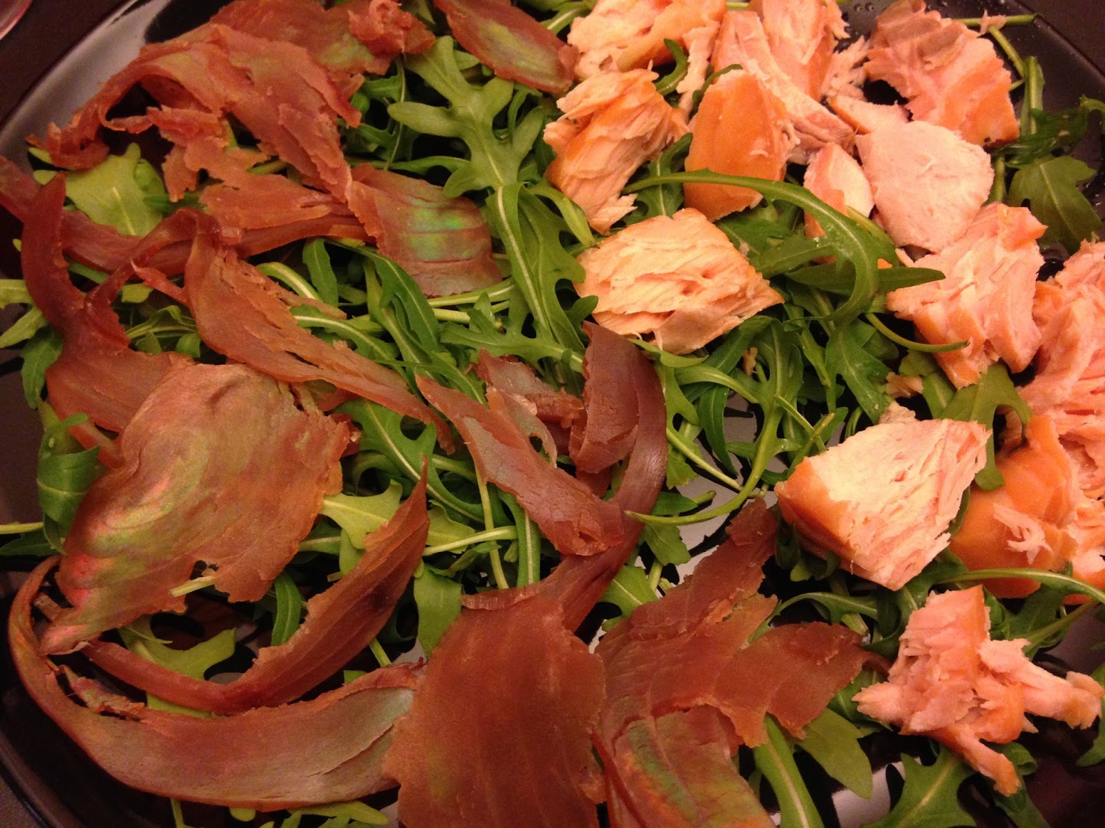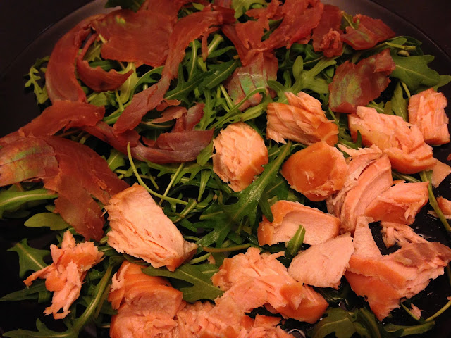 Fare un letto di rucola in piatto ed aggiungere un po’ di tonno affumicato e un po’ di salmone affumicato.