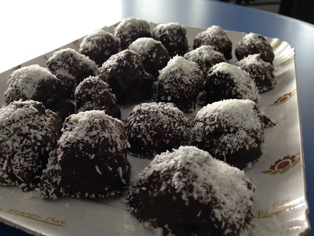 Adagiate le palline coperte di cioccolato sul vassoio utilizzato precedentemente e fate cadere a cascata il cocco che avete messo da parte avanzato. Lasciate asciugare ancora qualche minuto ed i cioccolatini sono pronti!