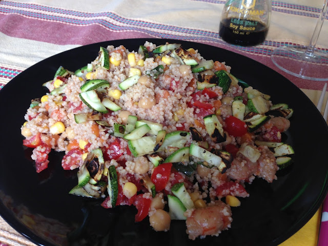 300 gr di cous cous pomodorini datterini, 1 barattolo di mais, ceci, acqua, zucchine, carote, sale q. b., Shoyu e olio a piacere (io ho utilizzato Oleum Viride extra virgin olive oil di OLEA B.B. d.o.o.).