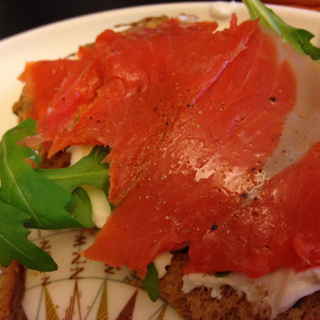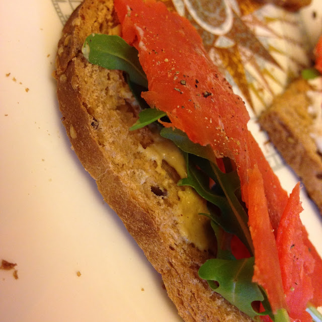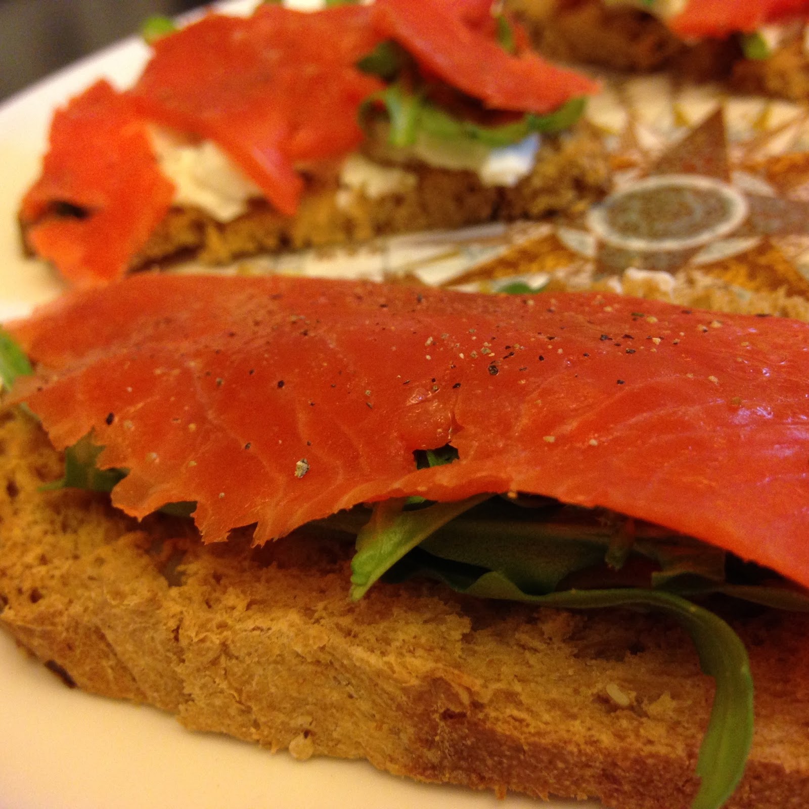 Pane ai semi, salmone affumicato, Philadelphia Balance, senape, rucola del nostro orto, sale, pepe, limone.