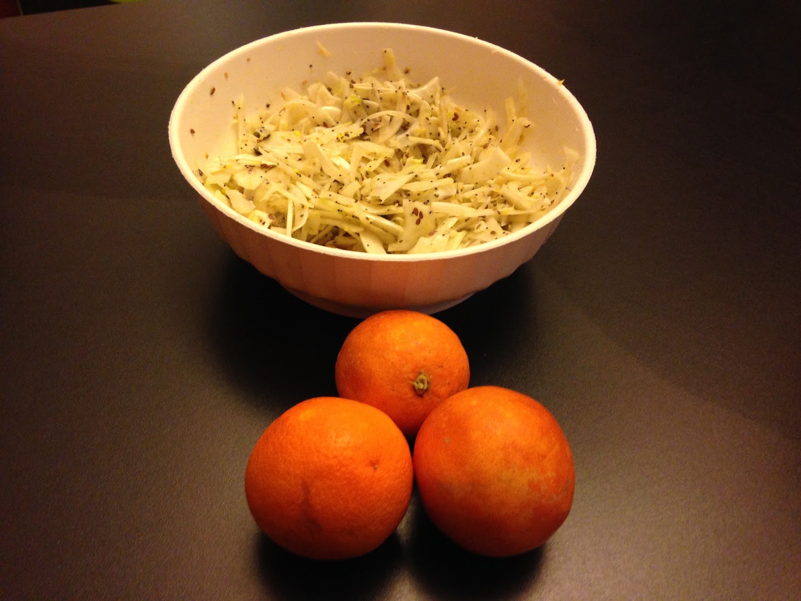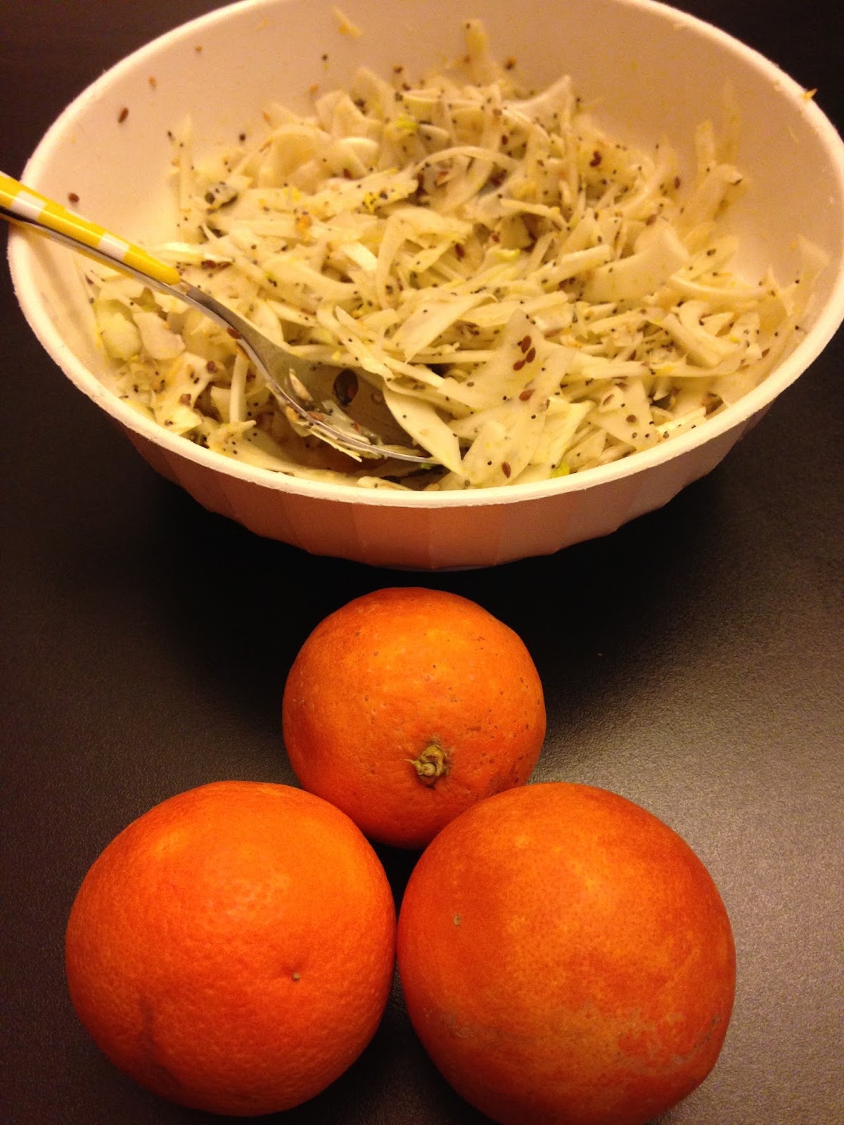 Tagliare con il finocchio, sottile sottile, metterci sopra il succo di un’arancia, aggiungere un po’ di semi misti, di semi di papavero e di semi di chia, un po’ di sale e un po’ d’olio. Lasciarli insaporire bene in una ciotola.