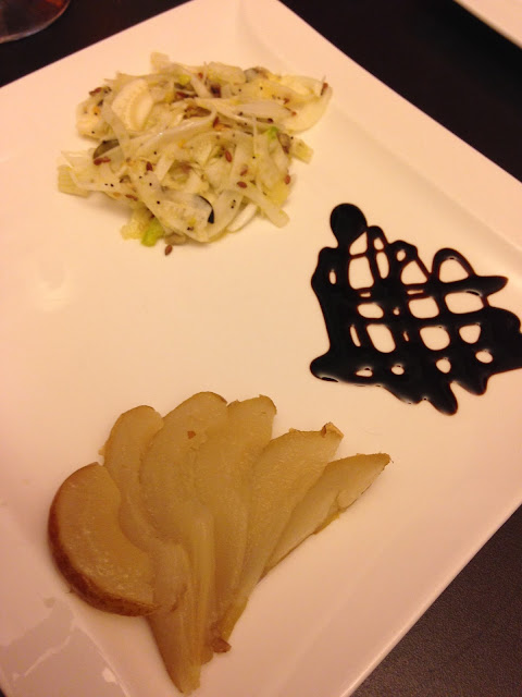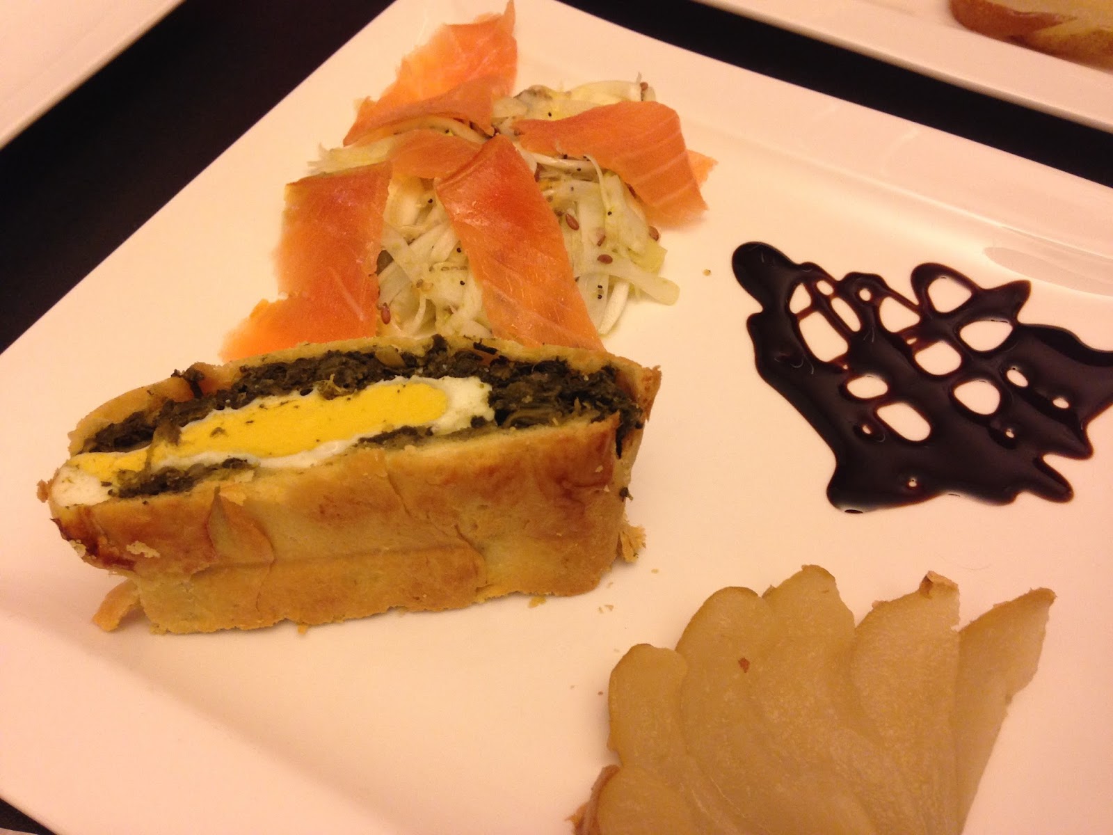Finocchi all’Arancia con Salmone, tortino Spinaci e Uova, Crema di Balsamico e Pere al Vapore