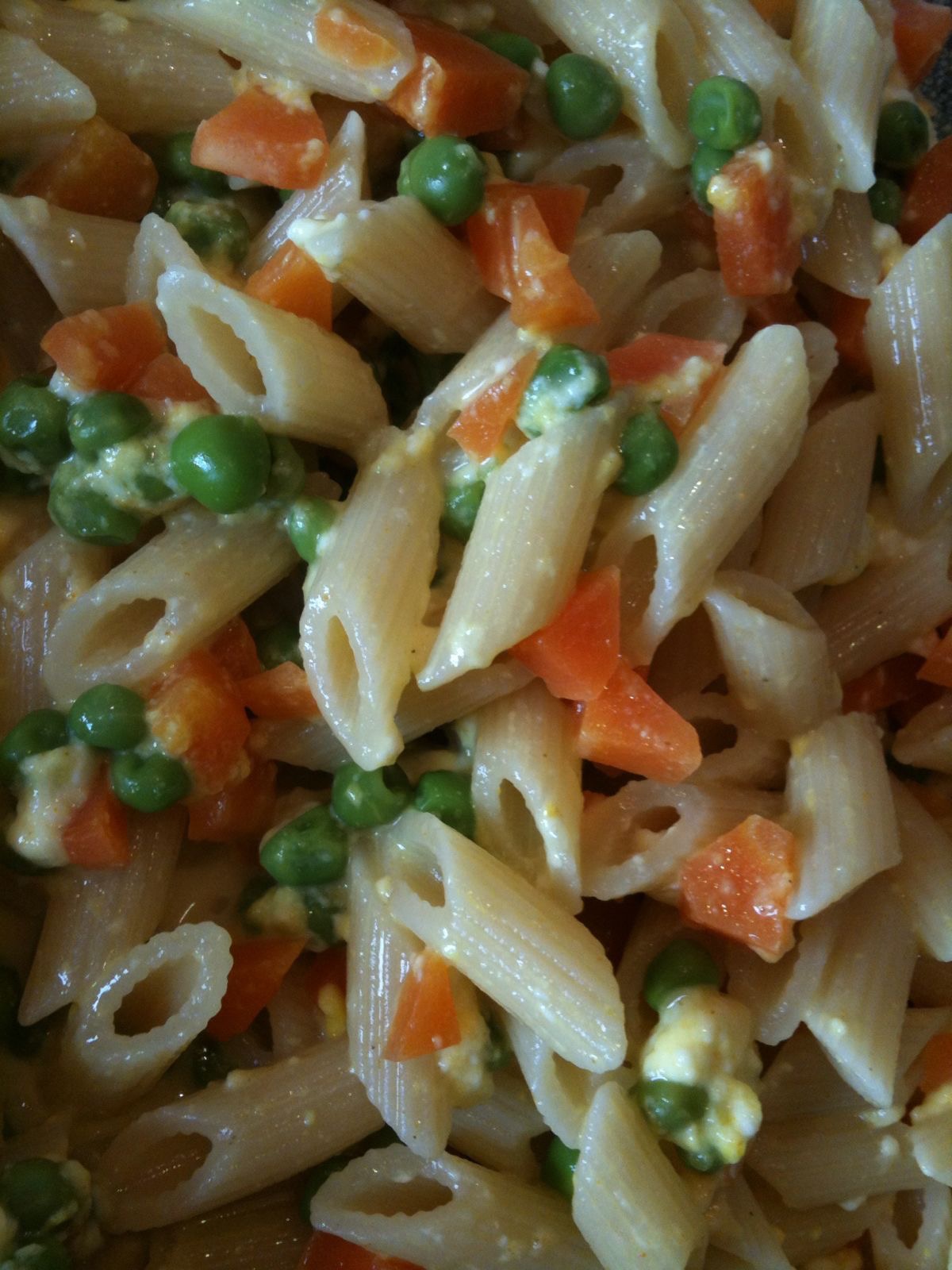 Mezze penne rigate, piselli, carote, stracchino.