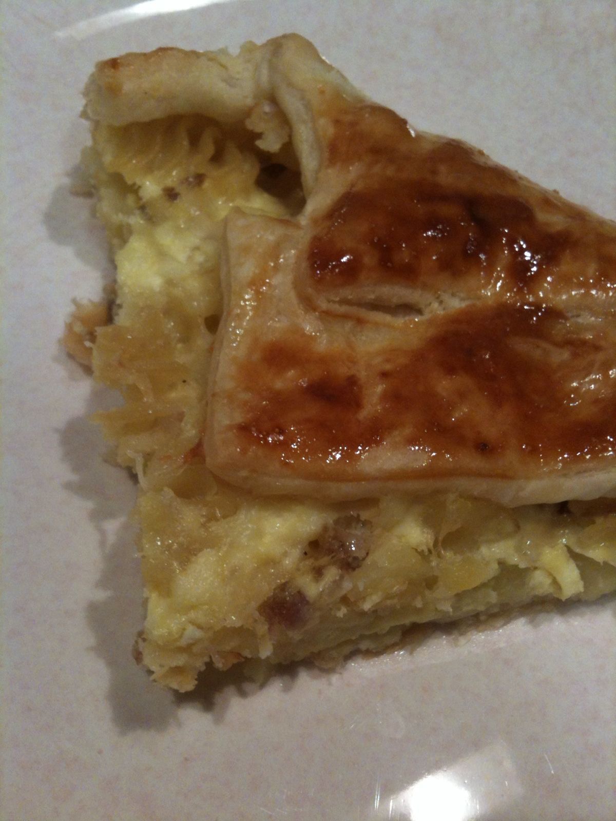 Cuoci 1 hg di pasta con una patata a cubetti, scola e fai raffreddare. Condisci con grana e salsiccia precedentemente passata in padella. Versa la pasta in una teglia da forno foderata di pasta sfoglia, versa sopra 2 uova sbattute e spennella con un tuorlo. Metti in forno 25″ a 200°.