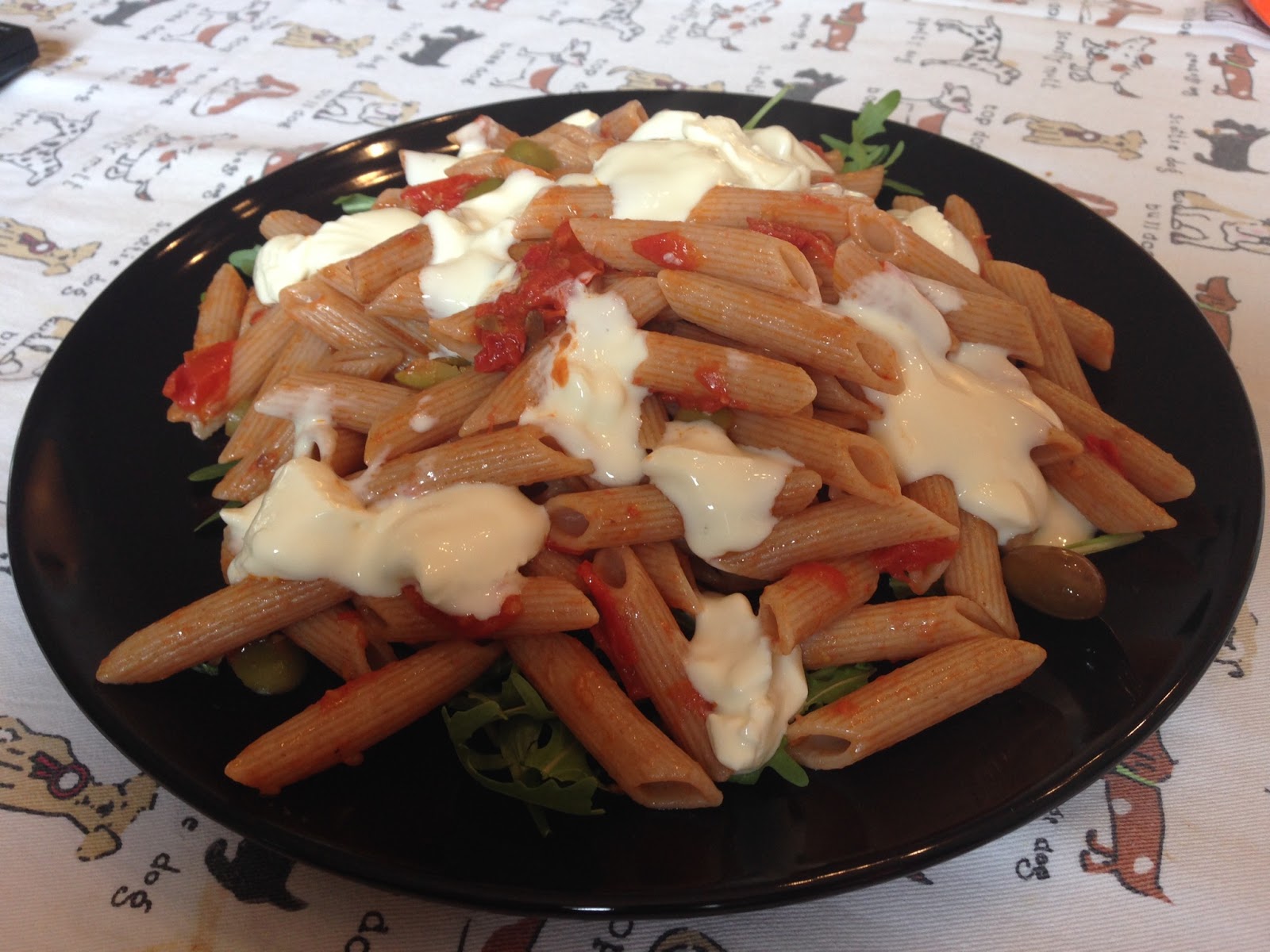 Penne Semi Integrali al Farro, pomodorini, Olive Veri, Olive taggiasche, stracchino, rucola un po’ di, olio.