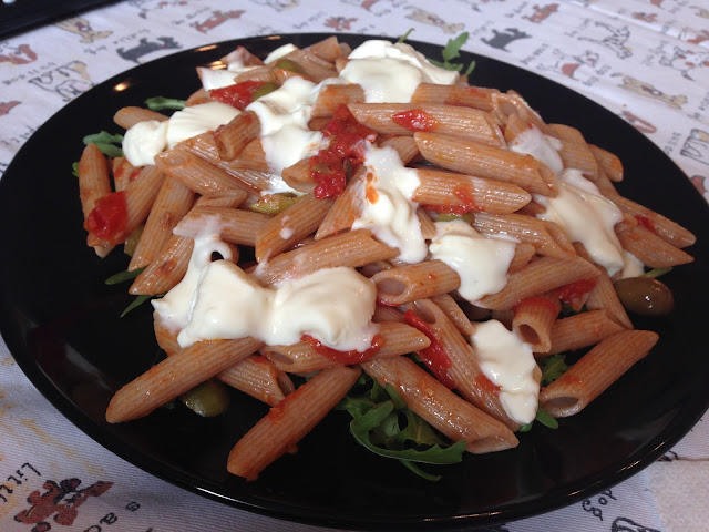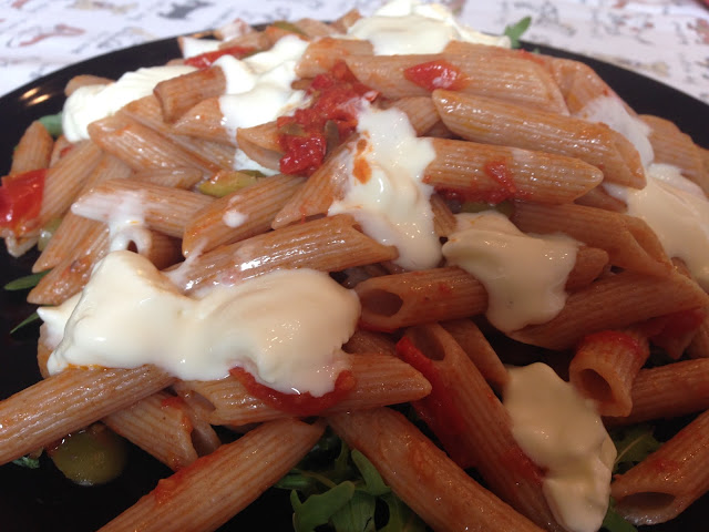 Penne Semi Integrali al Farro con Pomodorini, Olive Veri, Olive taggiasche e Stracchino su letto di Rucola
