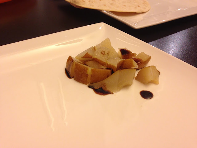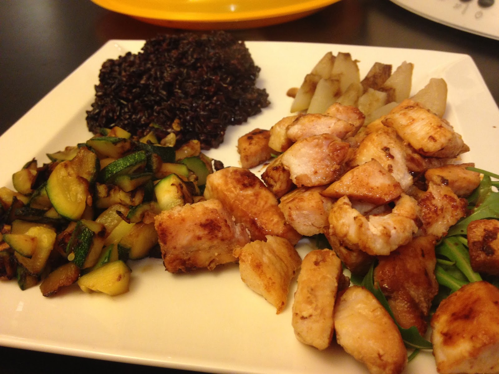Servire il pesce spada sopra ad un po’ di rucola fresca, il riso venere, la tartare di zucchine e le pere con un po’ di crema al balsamico.