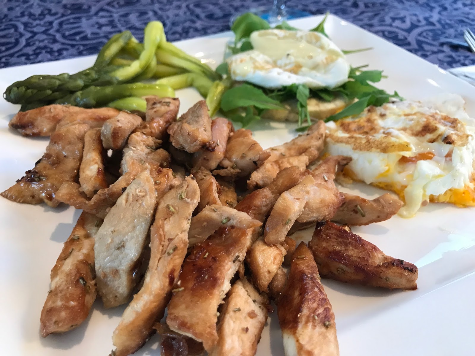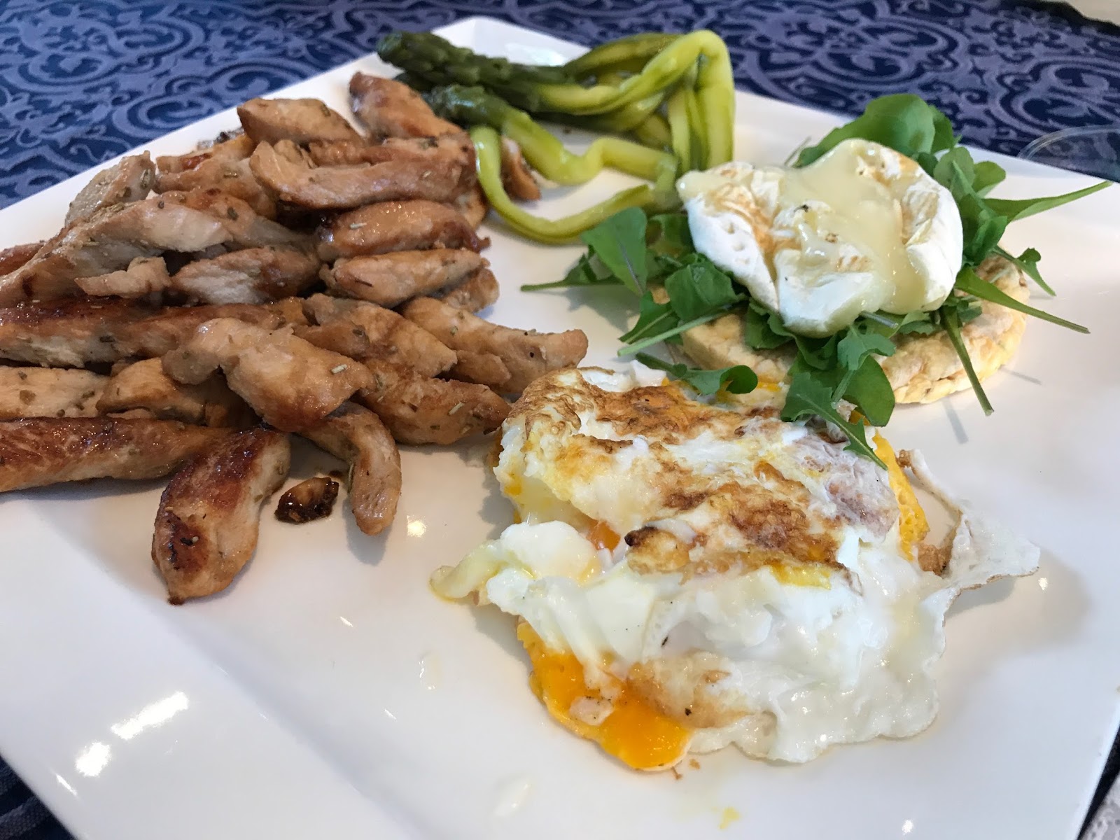 4 Fettine di pollo, 2 uova, 2 piccoli tomini, 2 gallette di farro, rucola del nostro orto, asparagi verdi, Shoyu, rosmarino, poco sale.
