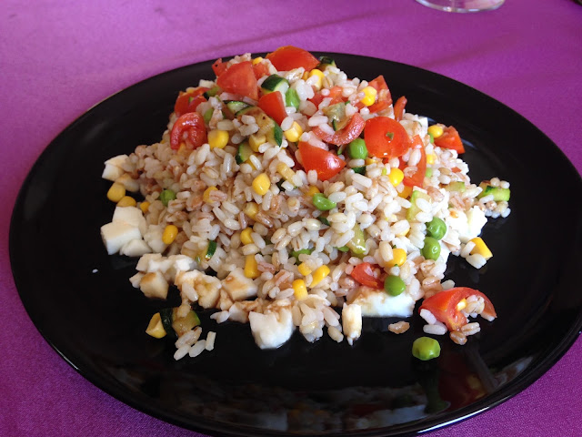 Riso, Farro, Orzo con Pomodorini, Mais, Zucchine Tartare alla Piastra, Pisellini Freschi, Olio e Shoyu se piace, 1 mozzarella.