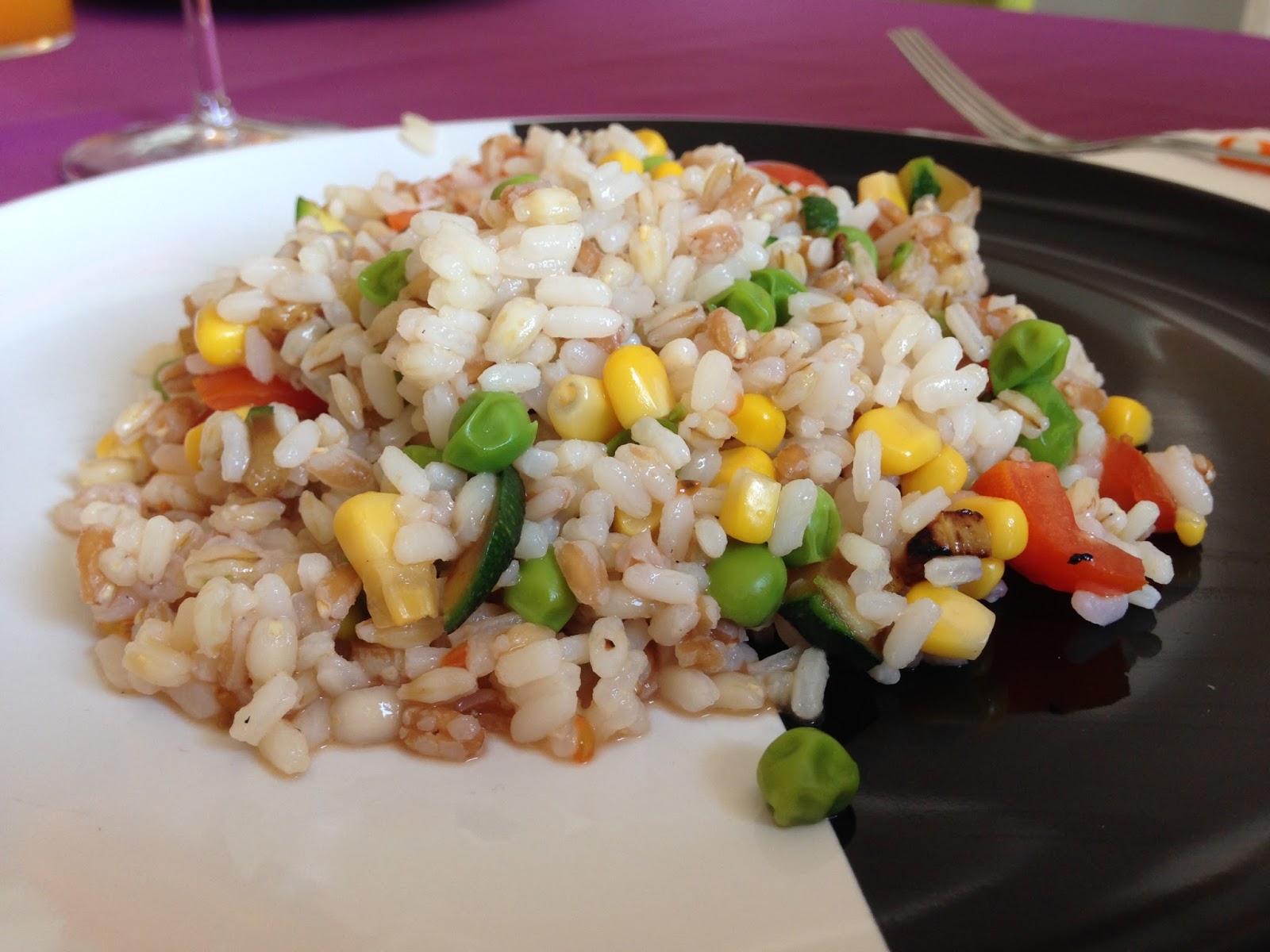 Riso, Farro, Orzo con Pomodorini, Mais, Zucchine Tartare alla Piastra, Pisellini Freschi e Mozzarella