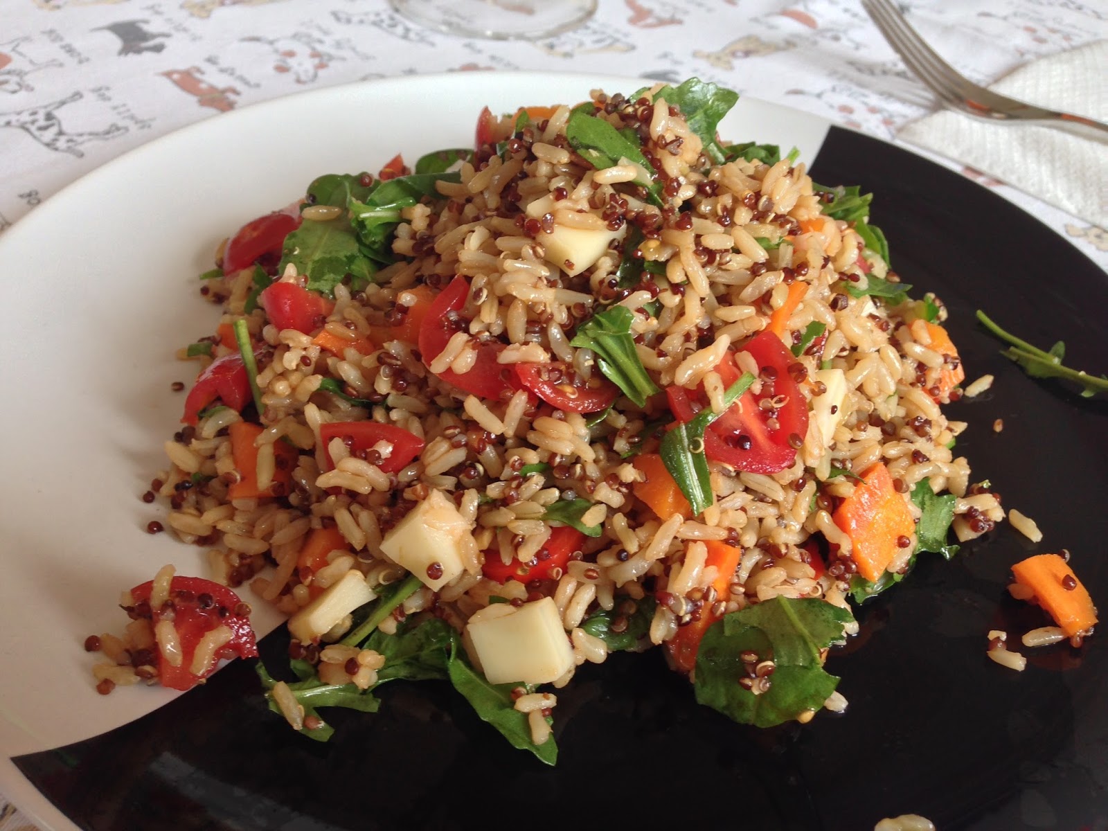 Riso lungo integrale, quinoa, pomodorini, carote, rucola, mozzarella veg.