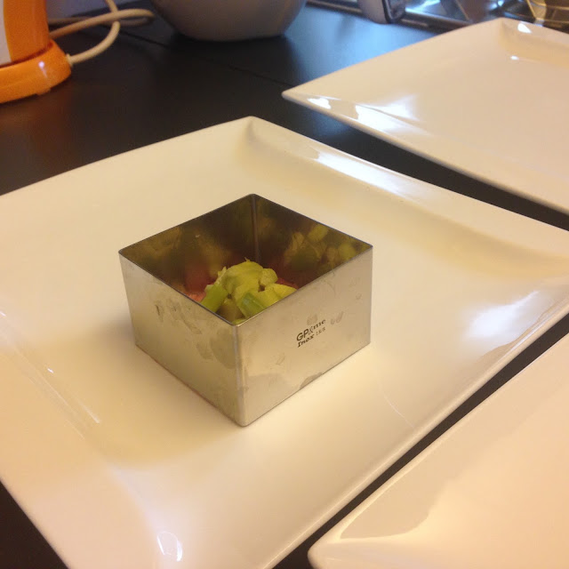 Assemblare il tonno con il coppapasta e sopra la tartare di asparagi e qualche punta intera. Condire con un po’ d’olio a piacere.