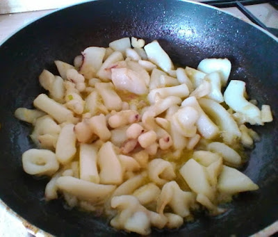 In una padella fate rosolare il cipollotto e lo spicchio d’aglio nell’olio evo, quindi unite la seppia e fate cuocere a fuoco medio per 15 minuti circa con il coperchio. Niente vino perchè amo sentire il profumo del pesce.