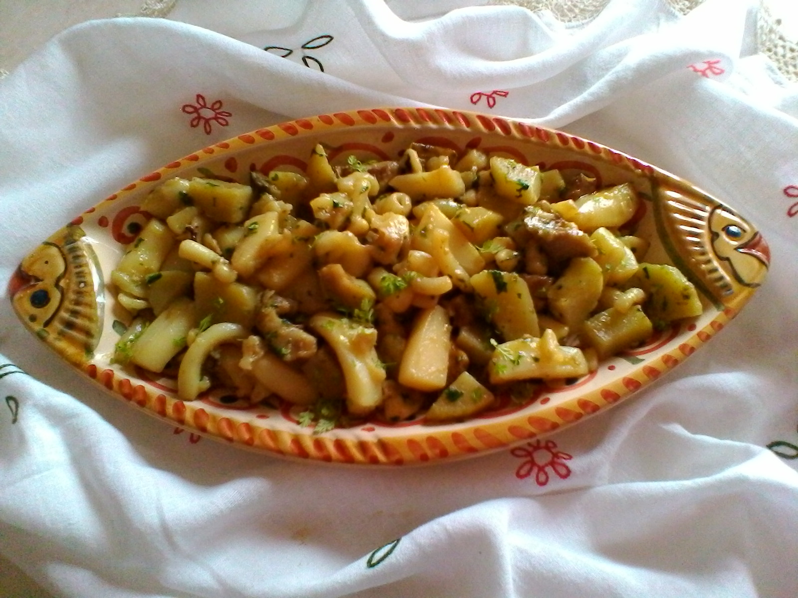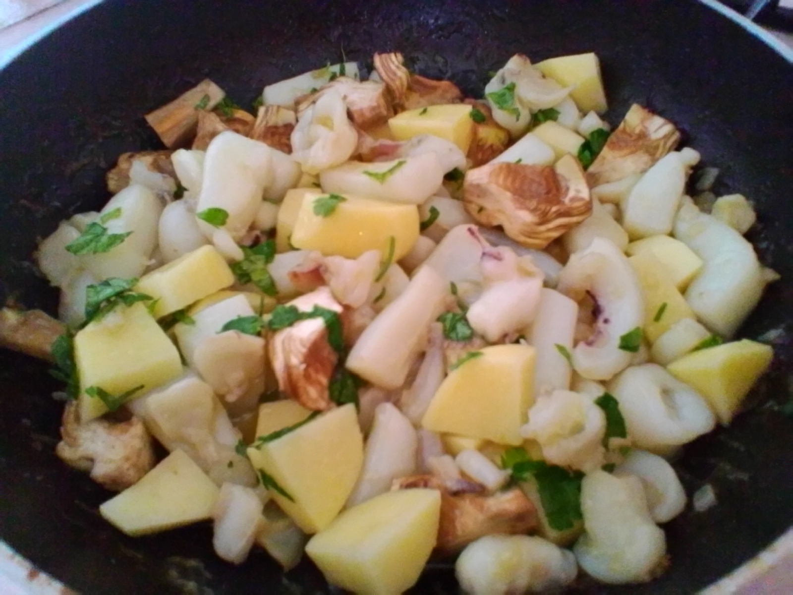 Aggiungete le patate e i carciofi, il sale, il peperoncino, il prezzemolo tritato e amalgamate per far insaporire il tutto.