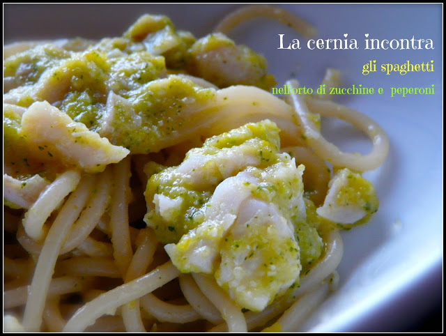 Io partecipo a questa settimana ricucinando un piatto di qualche tempo fa: gli spaghetti con cernia dorata in salsa di peperoni e zucchine.