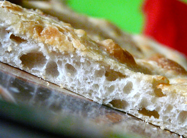 Schiacciamo l’impasto con i polpastrelli delle dita sul piano di lavoro infarinato fino a dargli la forma rettangolare e lo spessore desiderato, senza perdere l’aria così faticosamente incorporata e per permettergli di sviluppare in cottura una bella alveolatura.