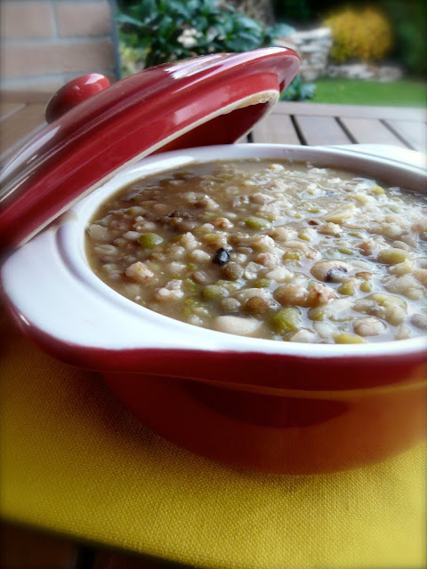 - circa 500 g di piselli verdi, orzo, farro, fagioli dall’occhio, lenticchie rosse e verdi, fave, fagioli verdi azuchi. Le quantità di ognuno degli ingredienti sono variabili. Cercate magari di fare dosi abbastanza uguali per ognuno.