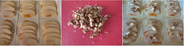 Adagiamo le fettine di mela sulla confettura avendo cura di lasciare sempre libero il bordo dei nostri rettangoli. Sgusciamo e tritiamo grossolanamente le noci quindi distribuiamole sulla sfoglia, facciamo lo stesso con lo zucchero e completiamo con qualche fiocchetto di burro. Spennelliamo la sfoglia con il tuorlo d’uovo sbattuto ed inforniamo, a forno preriscaldato a 180°, per 25′.