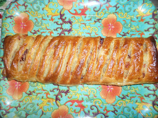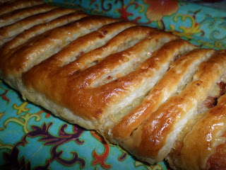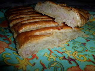 A questo punto prendere la sfoglia stenderla e tagliarla a strisce, aggiungere il composto sopra, e chiuderla a mo di sacchetto , girarla e metterla in un stampo coperto di carta da forno, mi raccomando con il forno caldo a 180° per una ventina di minuti, poi dipende dal vostro forno.
