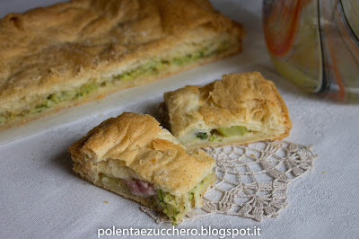 - Stendere della pasta sfoglia pronta e cospargerla con alcuni cucchiai di pane grattugiato poi distribuirvi sopra il broccolo appena cotto (lasciare un centimetro libero lungo i bordi). Cospargere con circa 50 gr di pinoli tostati in un padellino caldo e grattugiare sopra a filetti una buona dose di Montasio di 6 mesi. Terminare con tre fette di salame che saranno ridotte e pezzetti spezzandole con le mani e infine distribuite su tutto il ripieno.