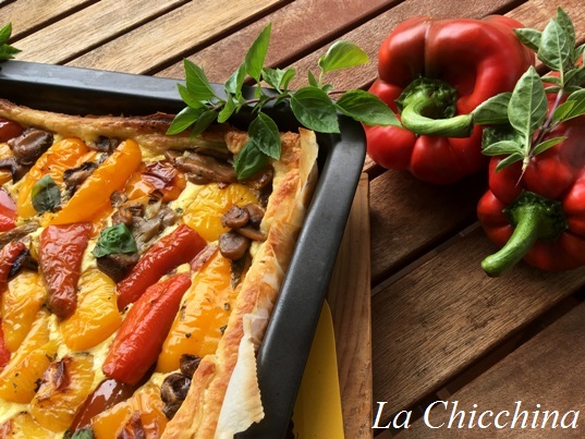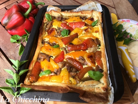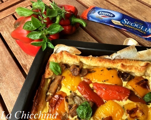 Cottura: 10 minuti per ripassare in padella i peperoni + 10 minuti per ripassare i funghi + 30 minuti in forno preriscaldato a 180° per la sfoglia