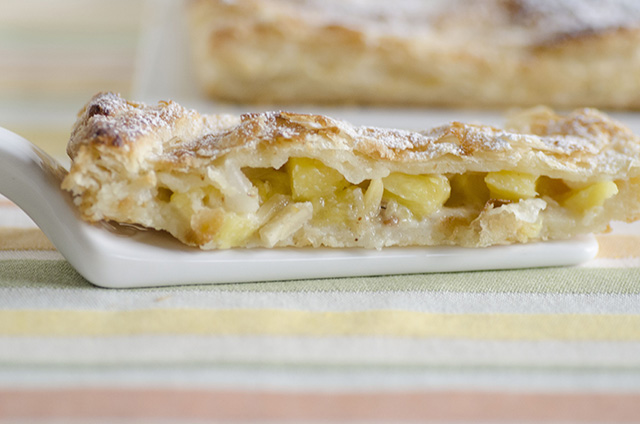 Alla base della prima sfoglia, in modo che faccia da isolante, cioccolato bianco grattugiato al posto della classica frangipane o pasta di mandorle.