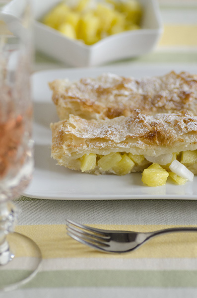 Oggi con una accoppiata inventata: ananas fresco con cubetti di cocco idratato, avvolti in una fragrante sfoglia, ovviamente fatta in casa.