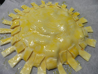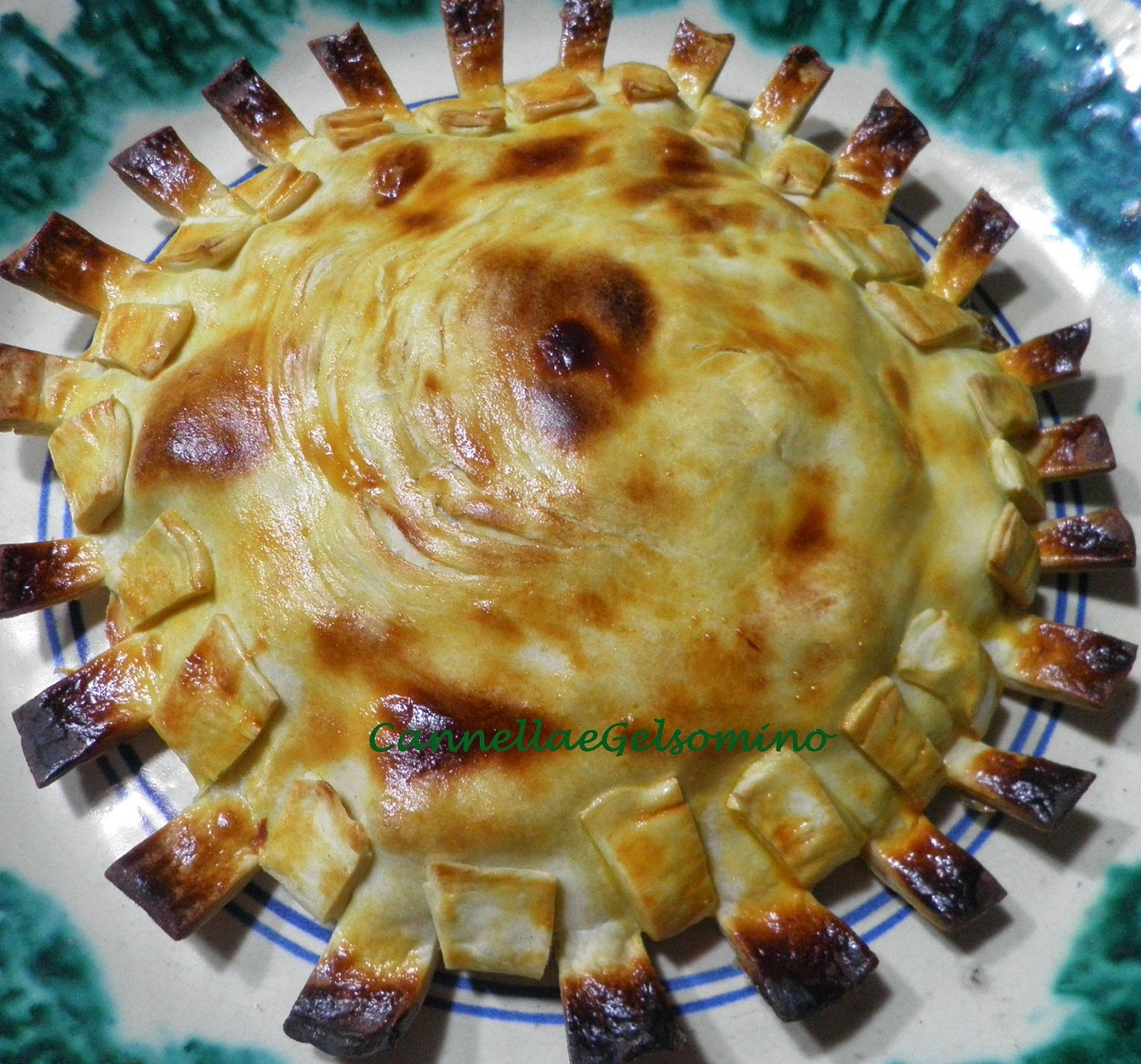 Coprite con l’altro disco di pasta facendo attaccare bene i bordi, quindi tagliate tutt’attorno dei raggi che andranno ripiegati verso l’interno alternandoli.