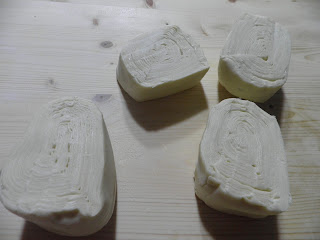 Avvolgete il cilindro nella pellicola e fate riposare in frigo per mezz’ora. Tagliate ora il cilindro in 4.